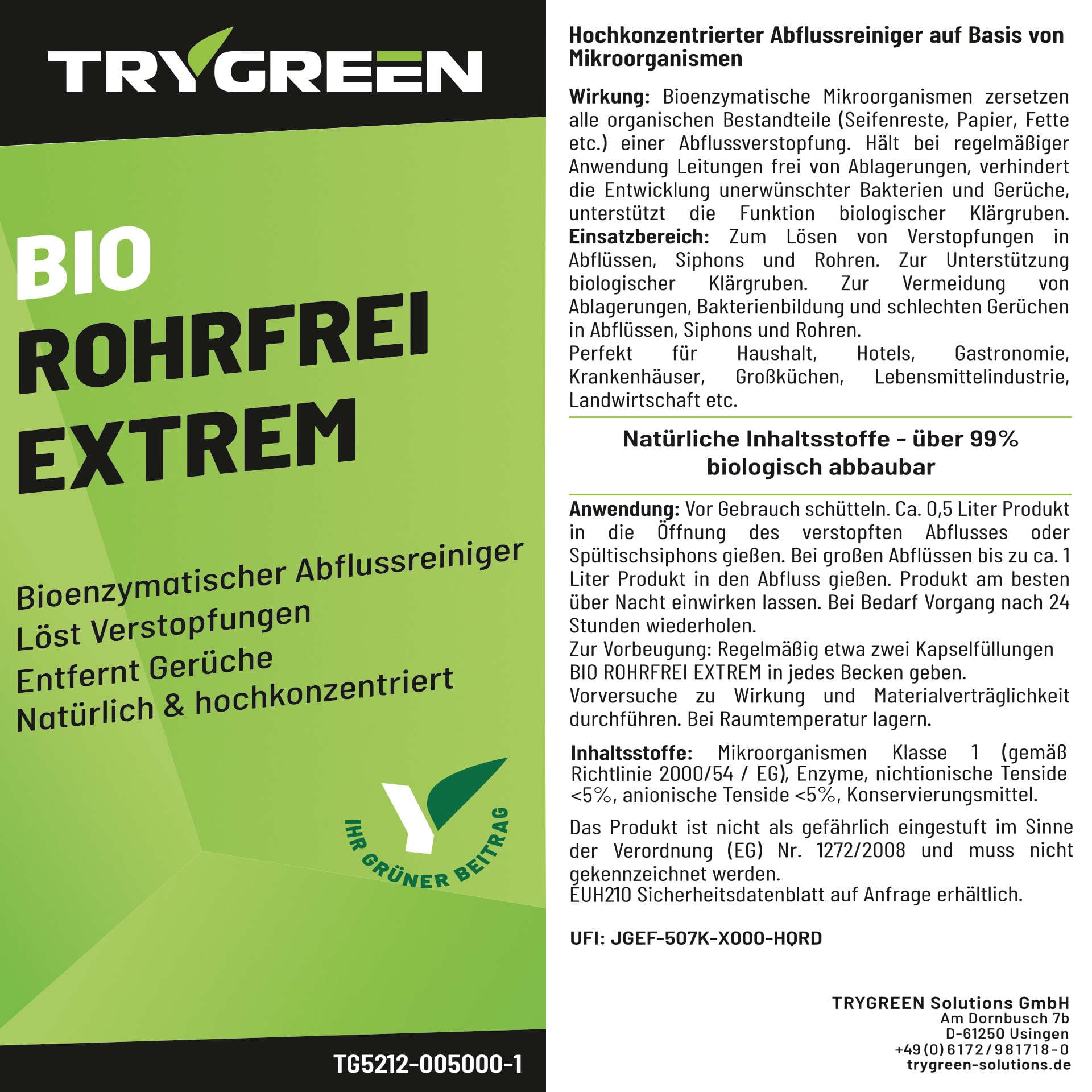 Der Abflussreiniger BIO ROHRFREI EXTREM ist die ideale umweltfreundliche Alternative für alle, die auf chemische Rohrreiniger verzichten möchten. Dieser hochwirksame Rohrreiniger löst zuverlässig Verstopfungen durch Ablagerungen in Abflussrohren und ist nahezu vollständig biologisch abbaubar.